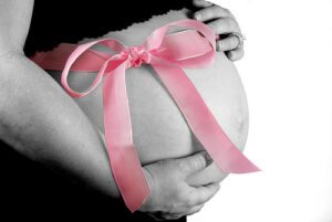 Blue bow for a boy, pink bow for a girl, or something neutral if the gender will be a surprise.